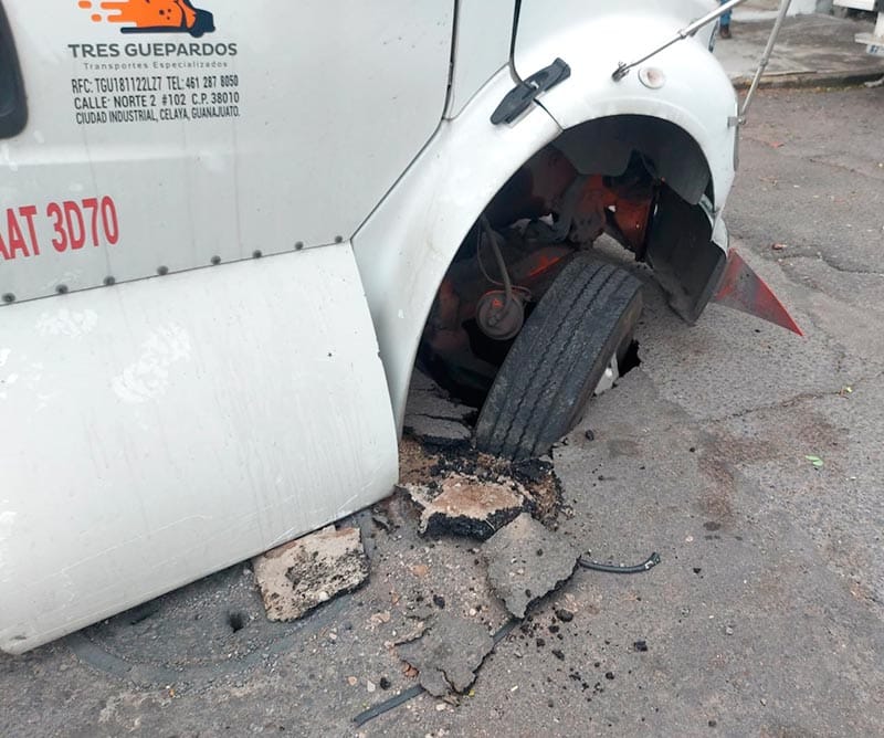 El conductor del camión, Luis Aguilar Martínez, de 37 años, explicó que mientras realizaba la maniobra para estacionarse, uno de los neumáticos delanteros del camión cayó en un socavón que se formó al momento de pisar el pavimento.