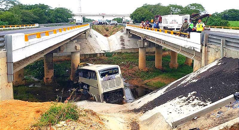 Socorristas constataron que, sobre un desnivel de 10 metros de profundidad, entre los dos carriles de la autopista La Tinaja-Acayucan, impactado contra una columna de concreto, se encontraba un autobús de turismo y decenas de pasajeros tendidos sobre el suelo, lesionados, a orillas de un arroyuelo.