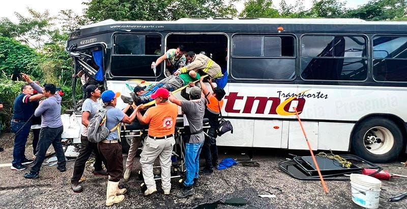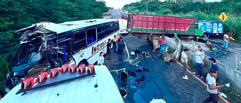 Un autobús de Transportes de Istmo chocó contra un camión de redilas sobre la carretera Jáltipan-Acayucan, cerca del balneario La Ceiba en el municipio de Soconusco, con saldo de 20 pasajeros lesionados, cinco de ellos graves.