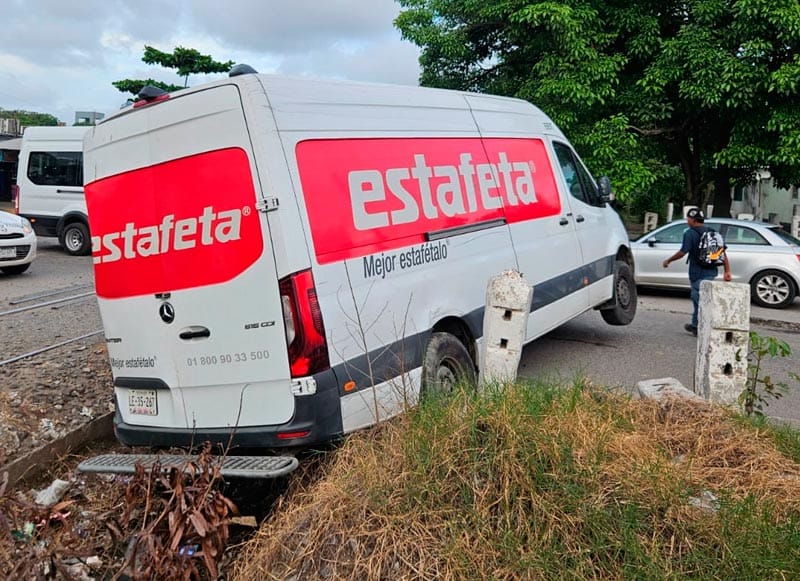 En la entrada del fraccionamiento Palma Real, en la ciudad de Veracruz, una camioneta de la empresa Estafeta fue impactada por una locomotora en el cruce ferroviario, arrastrándola algunos metros, dejándola con daños materiales.