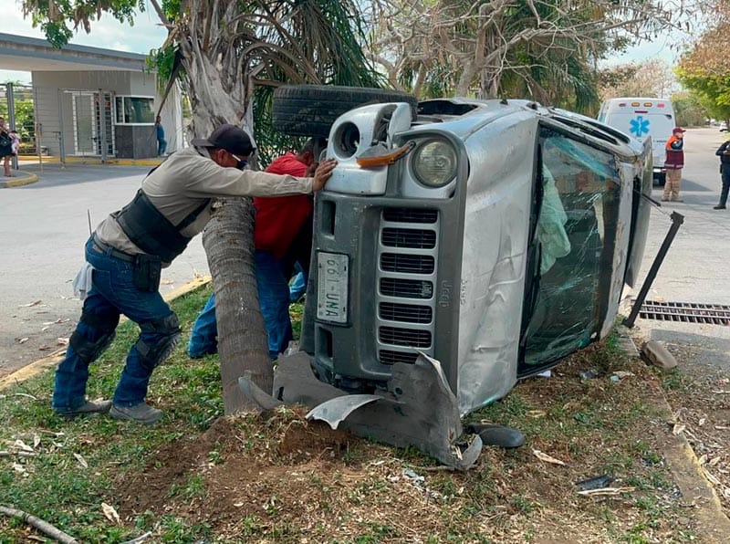 La unidad se proyectó hacia el camellón central, donde derribó un árbol seco y una palmera, para posteriormente dar una voltereta y quedar recostada sobre uno de sus costados.