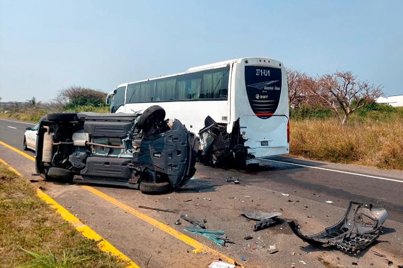 Un aparatoso accidente entre una camioneta y un autobús de turismo dejó una unidad volcada y un conductor lesionado la tarde de este sábado sobre la carretera Antón Lizardo–Boca del Río.