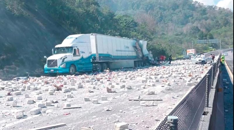 El tractocamión se habría quedado sin frenos porque incluso iba pitando, como alertando a los automovilistas y, a la altura de la salida de banderilla, embistió a un tractocamión marca Volvo acoplado a semirremolque tipo caja seca, razón social Fluedan Fletes del Desierto, número 371, que transportaba productos de plástico.