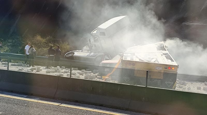 *Un tractocamión cargado con blocks se quedó sin frenos y embistió a otro tráiler que estaba detenido porque el chofer estaba subiendo a unos franeleros quienes murieron aplastados