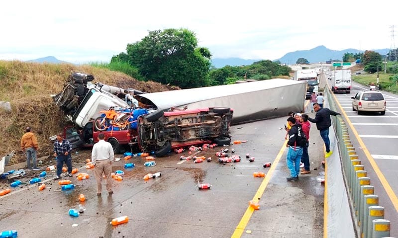Una dramática carambola de cinco vehículos, que culminó con la volcadura de tres unidades entre esas un tractocamión cargado con refrescos, dejó saldo de seis lesionados, el accidente ocurrió sobre autopista Córdoba-Veracruz, en Rancho Trejo.