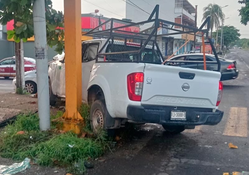 Tras el fuerte golpe, la camioneta dio un giro descontrolado, colisionó contra la base del semáforo, además derribó un poste de concreto de Pemex con indicaciones de “prohibido excavar”.