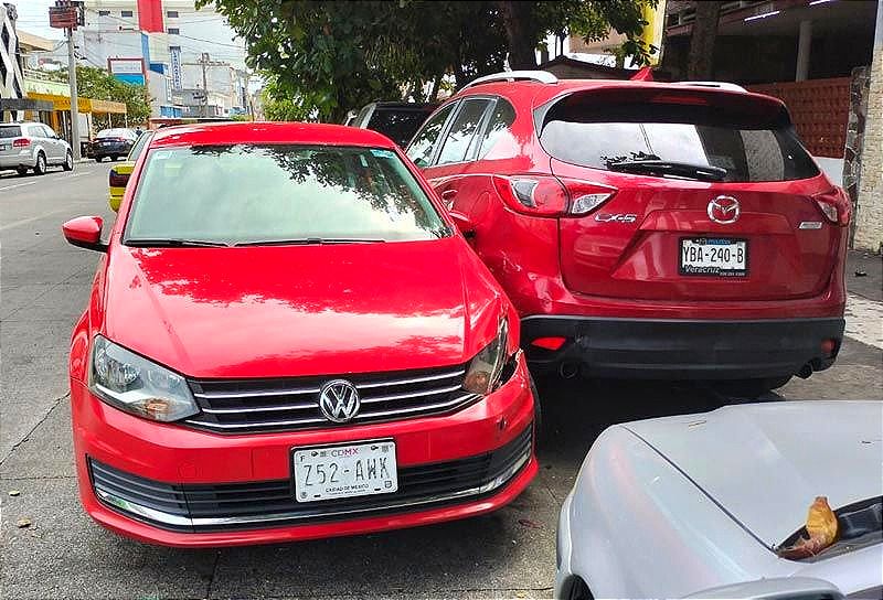En calles de la colonia Ricardo Flores Magón, en la ciudad de Veracruz, hubo un percance vial entre un automóvil, tipo Vento y un carro no identificado, proyectándose contra una camioneta estacionada.