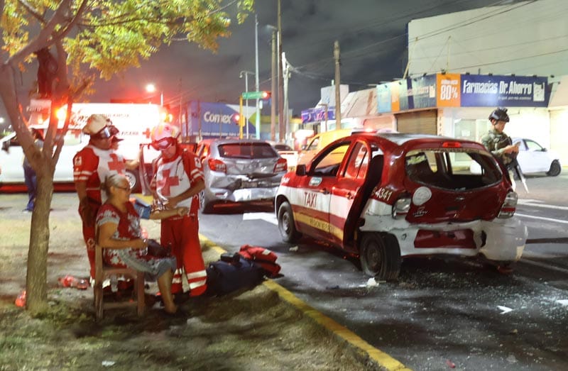 El impacto inicial fue contra un taxi Nissan March económico número 4341, conducido por Luis Reyes Leyva, de 58 años, quien transportaba a una pasajera identificada como Celia, de 56 años, la cual presentó contusiones tras el choque.