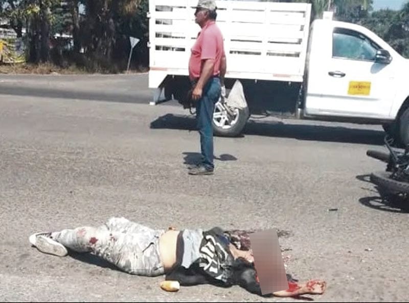 Acudió una patrulla de la SSP constatando que un camión cargado con caña había arrollado a una pareja que viajaba a bordo de una motocicleta e incluso a la mujer le pasó una llanta por encima, provocando machacamiento de cráneo y la muerte instantánea.