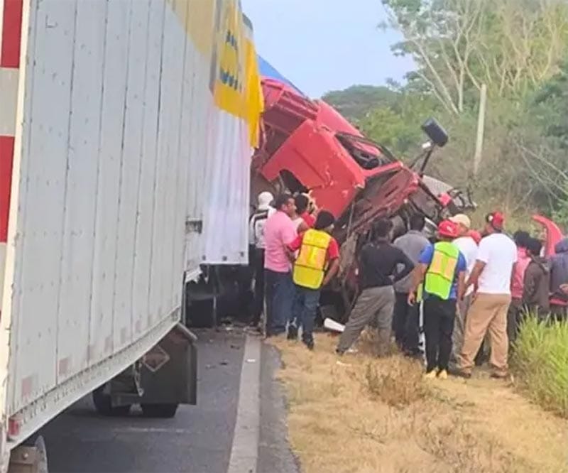 *La cabina del camión de carga de la empresa Coppel quedó destrozada por el choque de frente en la carretera la Tinaja-Paso del Toro