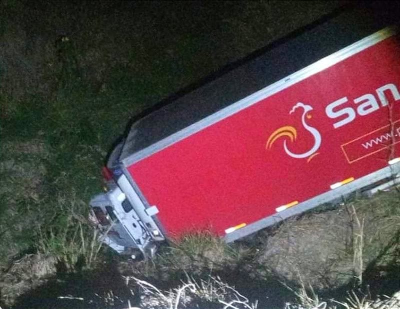 A unos 15 metros de distancia, volcado en una ladera, estaba un tractocamión color blanco, placas XN-4218-B de Veracruz, acoplado a semirremolque caja seca con razón social Avícola San Antonio, placas 4XX-443-B de Veracruz.