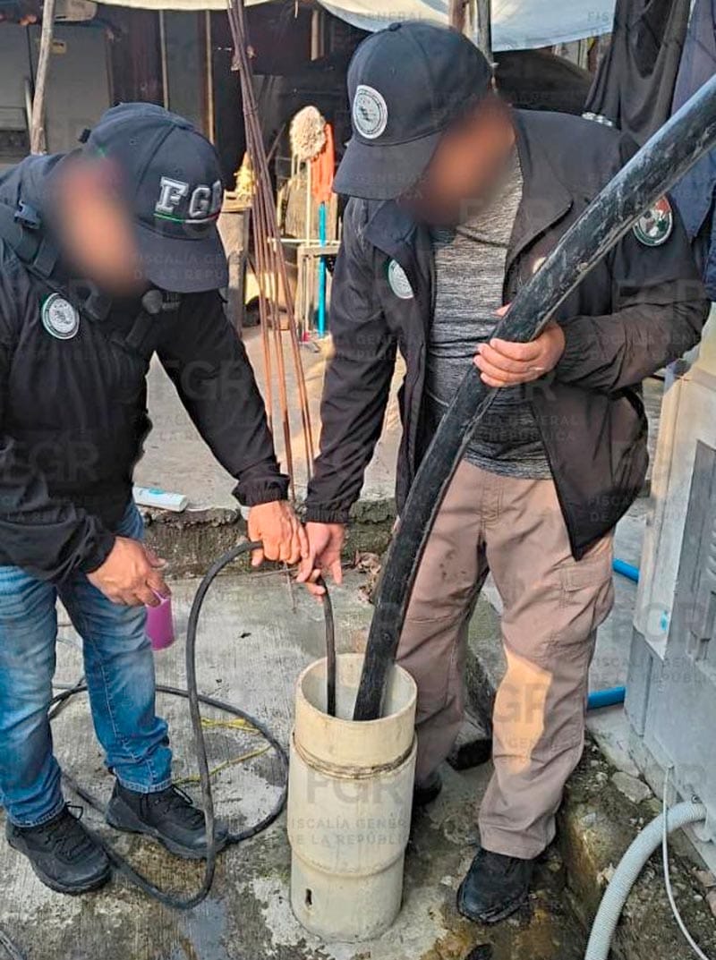 Los elementos de la Policía Federal Ministerial (PFM), en coordinación con peritos del Centro Federal Pericial Forense (CFPF), aseguraron una cisterna en el primer inmueble, una motobomba sumergible de succión, un DVR y cinco tramos de manguera de plástico.