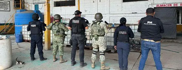 Fuerzas federales catearon un inmueble en la colonia Estero del Pantano, en Cosoleacaque, asegurando durante la diligencia 97 contenedores de plástico, cinco cisternas y 18 tambos, así como un tractocamión con semirremolque tipo autotanque, sin reporte de personas detenidas.
