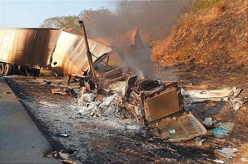 A metros estaba otro tractocamión con semirremolque tipo caja seca donde transportaba cítricos, esa unidad ardió tras el encontronazo quedando la cabina reducida a chatarra e incluso el fuego alcanzó el pastizal de la ladera del cerro.