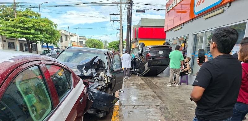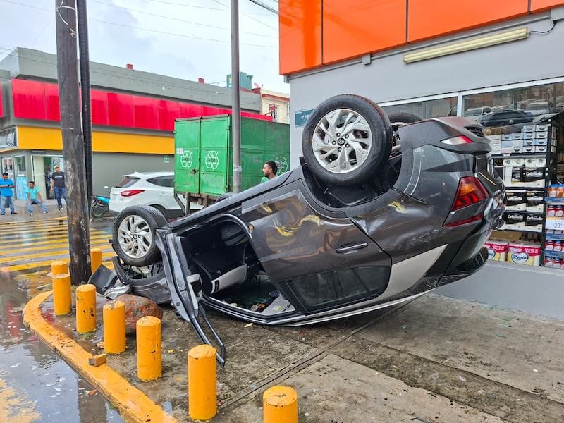 El golpe provocó que la unidad tipo Creta saliera proyectada y volcara, quedando con las llantas hacia arriba sobre la banqueta, ocasionando daños a un local de la empresa Supercito Chedraui.