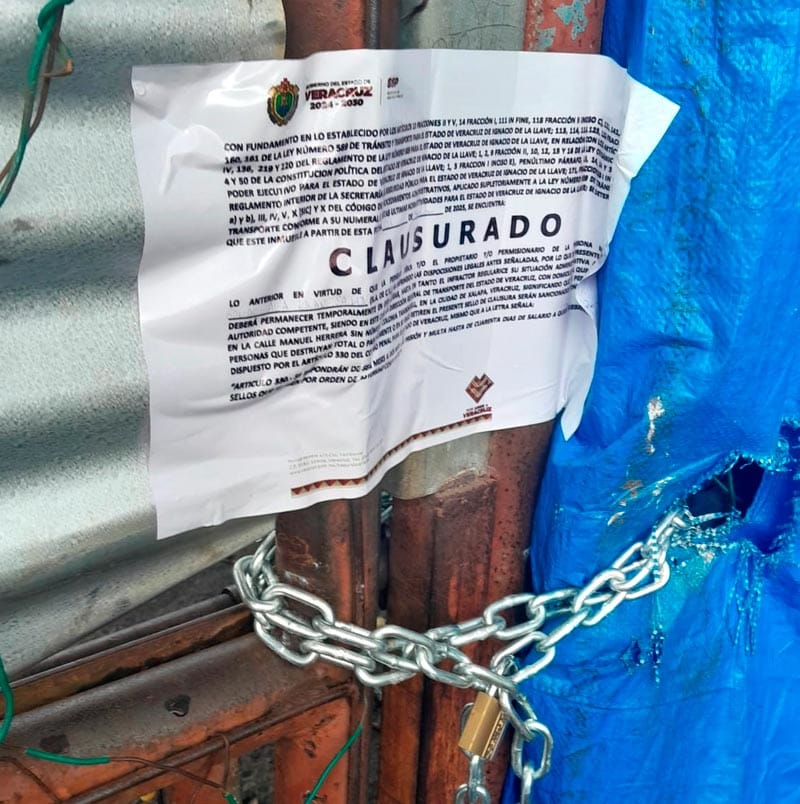 En los sellos de clausura instalados en las puertas de acceso a los corralones se advierte: clausurado temporalmente hasta que el propietario regularice su situación administrativa ante la Dirección General de Transporte, de la SSP.