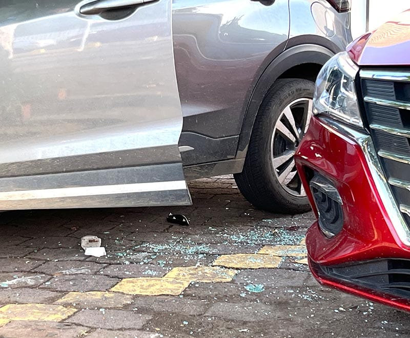 * Una camioneta Nissan Kicks tenía los cristales estrellados mientras una mujer sentada en el piso presentaba heridas en el rostro, manos y brazos