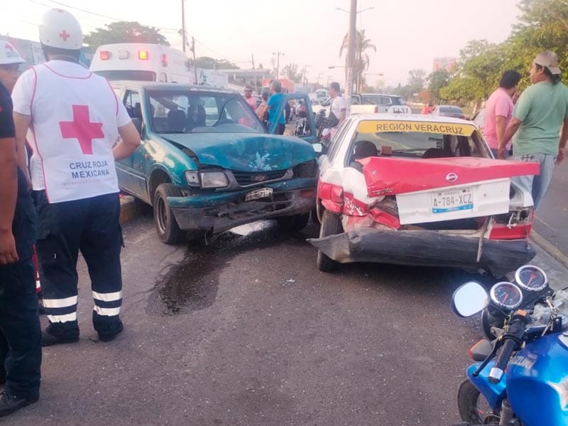 El incidente tuvo lugar este domingo sobre la avenida Miguel Alemán, a la altura de una conocida ferretería, donde una camioneta Chevrolet tipo pick up de color verde impactó en la parte trasera a un taxi Nissan Tsuru con número económico VB-5202, dejando heridos a sus pasajeros.