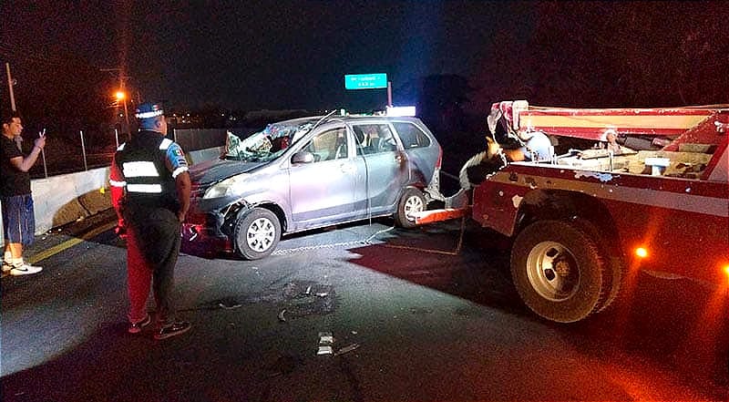 El impacto causó que la mujer al volante de la camioneta perdiera el control, chocando contra el muro de contención y volcando sobre su costado derecho, obstruyendo completamente el carril de alta y parcialmente el de en medio.