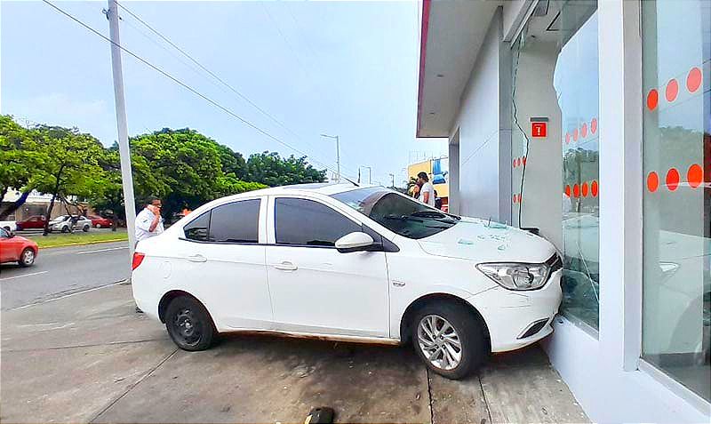 Posteriormente el Chevrolet Aveo continuó el recorrido y chocó contra un cristal panorámico de la sucursal de Santander, haciéndolo añicos, sin que se reportaran personas lesionadas.