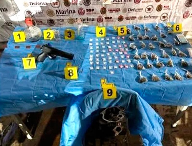 Se les aseguraron pipas hechizas, un arma de balines tipo réplica, cartucho útil, una báscula gramera, dos motocicletas, bolsas que contenían hierba seca o marihuana, así como bolsas que contenían polvo granulado (cocaína).