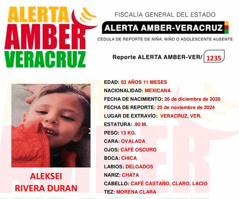 De acuerdo a la ficha de Alerta Amber Veracruz, se teme por la integridad de Aleksei Rivera Durán, ya que puede ser víctima de la comisión de un delito.