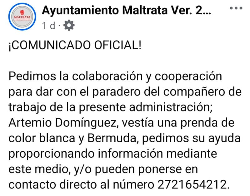 "Pedimos la colaboración y cooperación para dar con el paradero del compañero de trabajo de la presente administración; Artemio Domínguez, vestía una prenda de color blanca y Bermuda, pedimos su ayuda proporcionando información mediante este medio, y/o pueden ponerse en contacto directo al número 2721654212", señala lo publicado en la página oficial del Ayuntamiento de Maltrata.