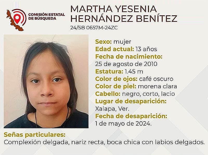 Una de las adolescentes responde al nombre de Martha Yesenia Hernández Benítez, la cual desapareció en el municipio de Xalapa, misma tiene ojos cafés, piel morena clara y cabello negro, corto y lacio.