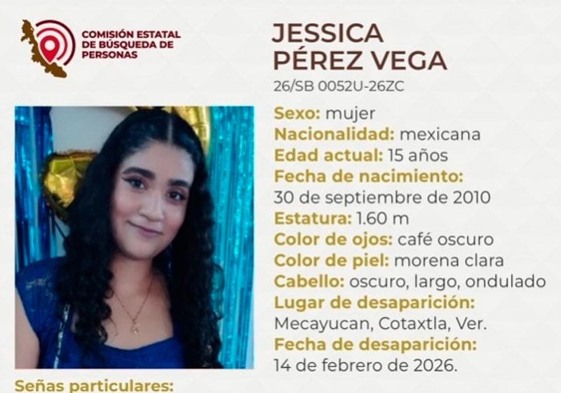 De acuerdo a la ficha 26/SB0052U-26ZC, publicada por la CEB, una de las adolescentes se trata de Jessica Pérez Vega, de 15 años de edad, quien desapareció el 14 de febrero de este 2026 en la comunidad de Mecayucan, municipio de Cotaxtla.