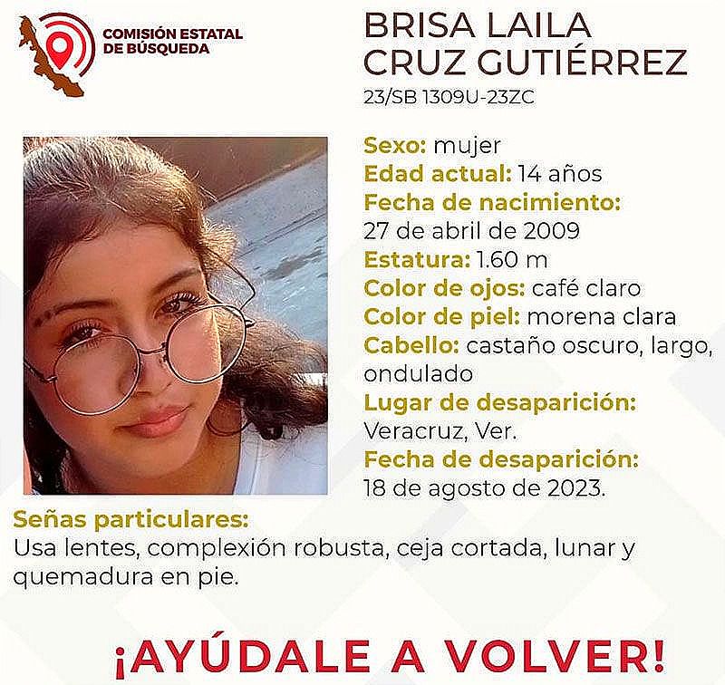De acuerdo a lo informado, se trata de Brisa Laila Cruz Gutiérrez, quien mide 1.60 metros, es de tez morena clara, tiene ojos color café claro y cabello castaño oscuro, largo y ondulado.