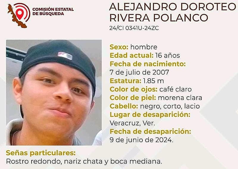 La primera ficha de búsqueda reporta la desaparición de Alejandro Doroteo Rivera Polanco de 16 años, quien mide 1.85 metros, es de tez morena clara, tiene los ojos color café claro y el cabello negro, corto y lacio.