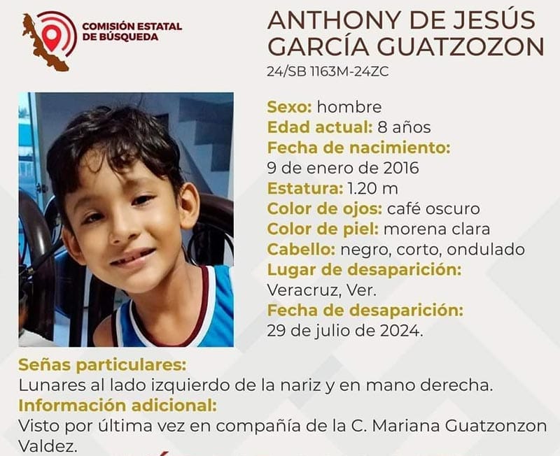 La Comisión Estatal de Búsqueda de Veracruz reportó la desaparición de Mariana Guatzozon Valdez de 30 años quien presuntamente iba acompañada de su menor hijo Anthony de Jesús García Guatzozon de 8 años cuando desaparecieron por lo que ambos son buscados.