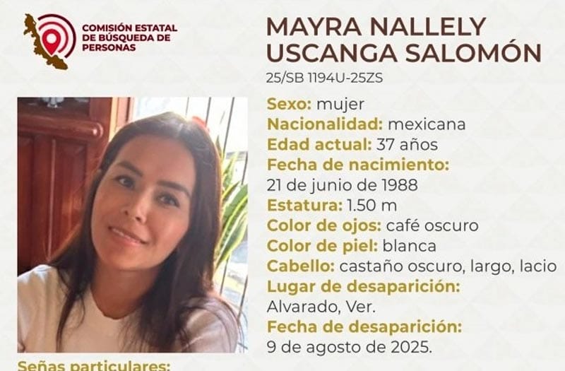 En tanto que la mujer reportada como desaparecida en Alvarado se llama Mayra Nallely Uscanga Salomón, de 37 años de edad, con quien se perdió contacto el sábado 9 de agosto.