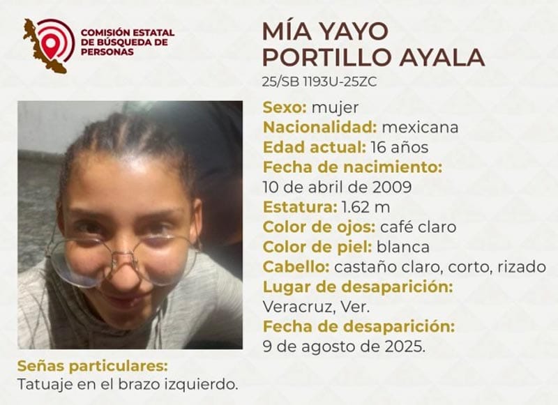 De acuerdo a la ficha 25/SB1193U-25ZC, publicada por la CEB, la adolescente se llama Mía Yayo Portillo Ayala, de 16 años de edad, quien desapareció el 9 de agosto de este 2025.