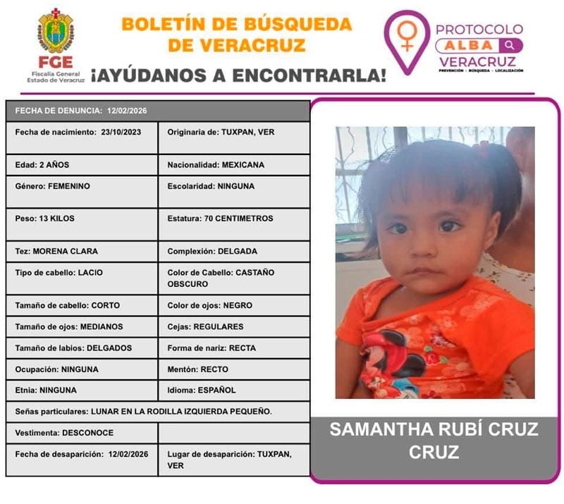 Tuxpan, Ver.(AVC).- La Fiscalía General del Estado (FGE) de Veracruz ha emitido una alerta urgente tras la desaparición de María José Cruz Cruz, de 16 años y Samantha Rubí Cruz Cruz, de apenas 2 años de edad.