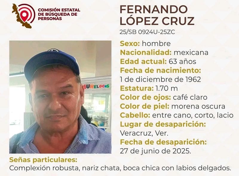 La Comisión Estatal de Búsqueda Veracruz reporta la desaparición de Fernando López Cruz, en la ciudad de Veracruz.