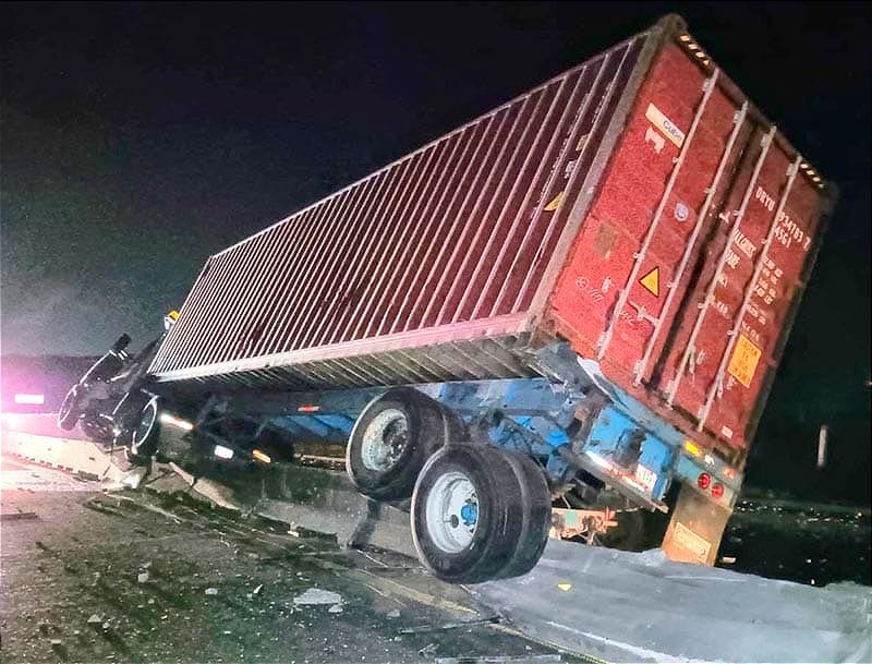 En la autopista Cardel-Veracruz, el conductor de un tráiler sufrió un percance luego de que aparentemente se quedó dormido al volante, pasando la caseta y el puente, terminó chocando y quedó encima del muro divisorio.