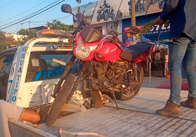 La moto Italika FT150 roja, sin placas, era conducida por Domiciano H. C., de 36 años, acompañado de Josué S. L., de 33, quienes fueron aventados tras el impacto del Jetta Clásico negro cuyo conductor se pasó el alto.