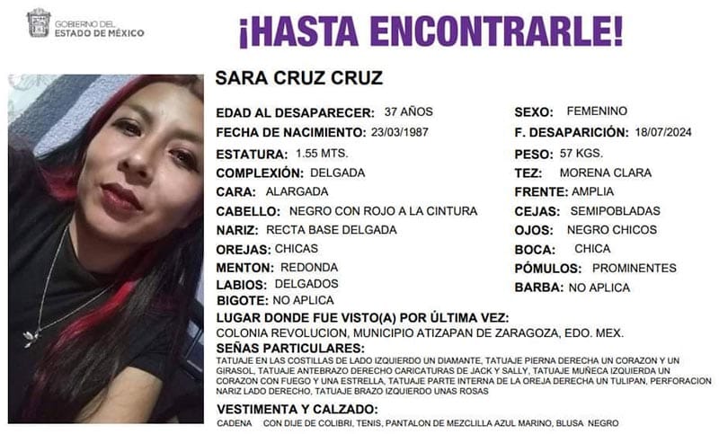 Desde ese momento se desconoce el paradero de Sara quien viajaba en una camioneta tipo Jeep, informaron familiares y autoridades de la FGJEM.