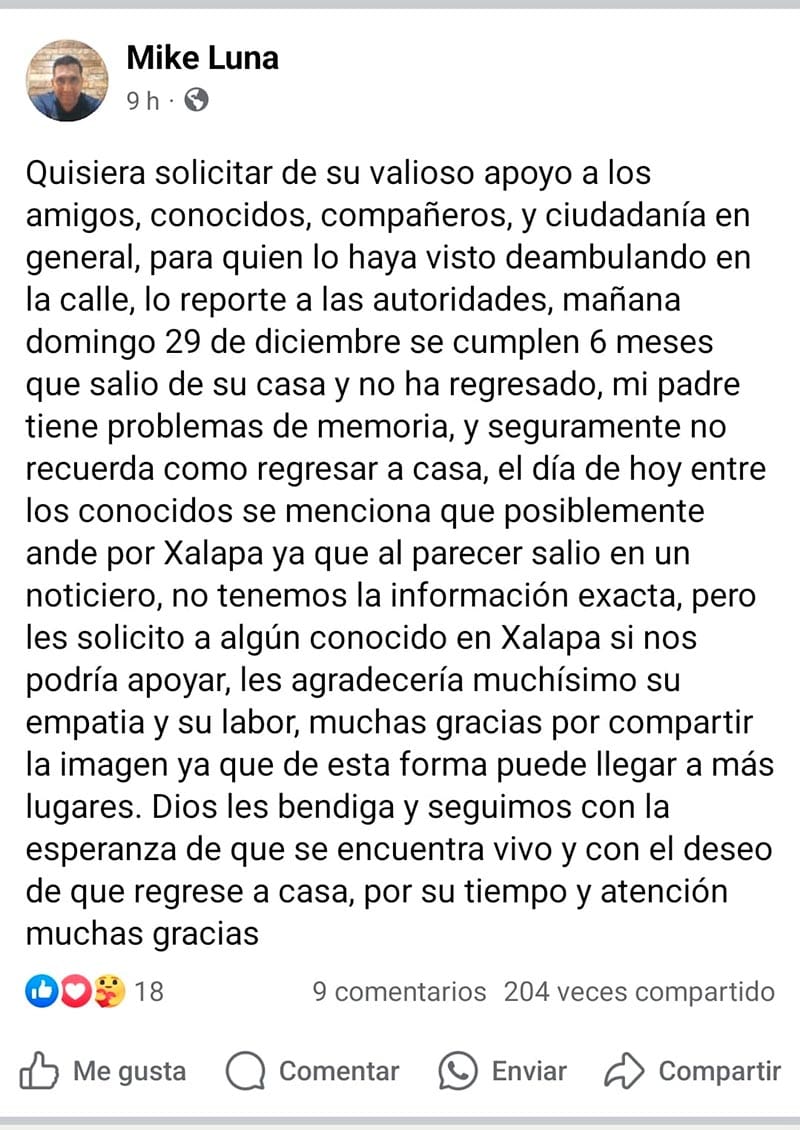 “Quisiera solicitar de su valioso apoyo a los amigos, conocidos, compañeros, y ciudadanía en general, para quien lo haya visto deambulando en la calle, lo reporte a las autoridades, este domingo 29 de diciembre se cumplen 6 meses que salio de su casa y no ha regresado, mi padre tiene problemas de memoria, y seguramente no recuerda como regresar a casa, el día de hoy entre los conocidos se menciona que posiblemente ande por Xalapa ya que al parecer salió en un noticiero, no tenemos la información exacta, pero les solicito a algún conocido en Xalapa si nos podría apoyar, les agradecería muchísimo su empatía y su labor, muchas gracias por compartir la imagen ya que de esta forma puede llegar a más lugares. Dios les bendiga y seguimos con la esperanza de que se encuentra vivo y con el deseo de que regrese a casa, por su tiempo y atención muchas gracias”, escribió Mike Luna, en sus redes sociales.