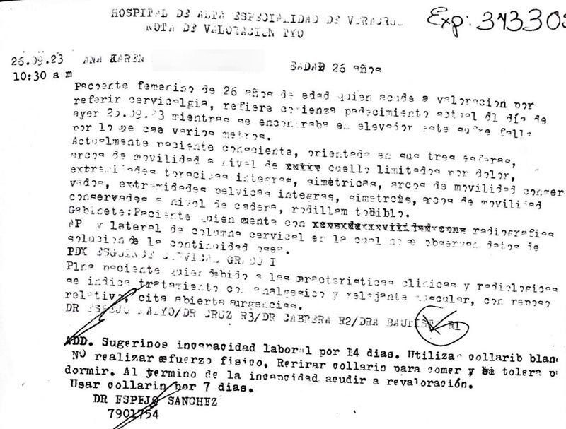 Documentos en poder de NOTIVER indican que Yareli C.G., de 28 años, fue atendida en urgencias del HAEV pues refería dolor cervical y se dictaminó esguince cervical de 2º grado, recomendando uso de collarín cervical por 7 días.