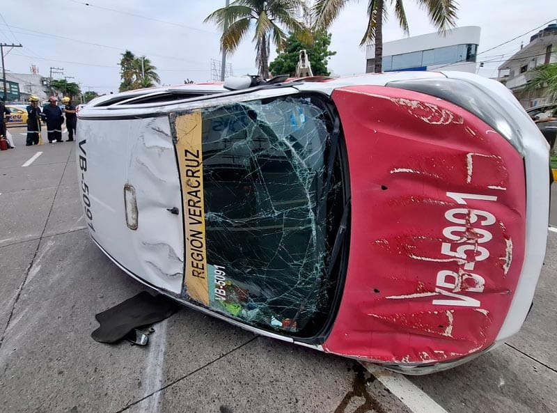 Por el brutal golpe, el taxi, económico VB-5091, salió proyectado varios metros hasta volcar y quedar con las llantas hacia arriba.