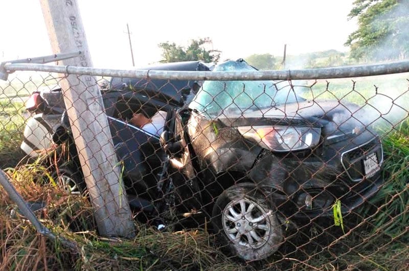 El automóvil salió del camino dando giros y se impactó brutalmente contra un poste de la CFE, instalado junto a la malla perimetral de la empacadora, el golpe alertó a pobladores de El Moralito.