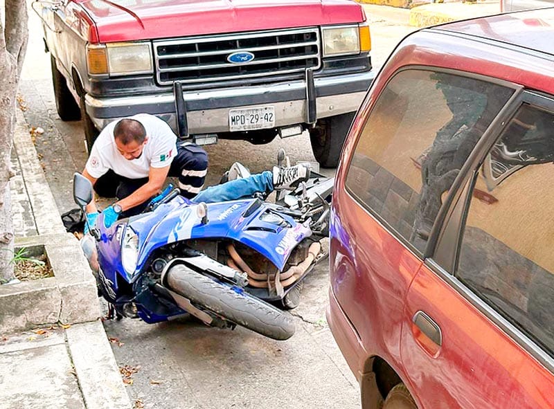 Un perito criminalista de la fiscalía de Tlapacoyan hizo el levantamiento del cadáver que quedó prácticamente sobre la motocicleta color azul metálico en la que viajaba, el cuerpo quedó tendido entre dos vehículos.