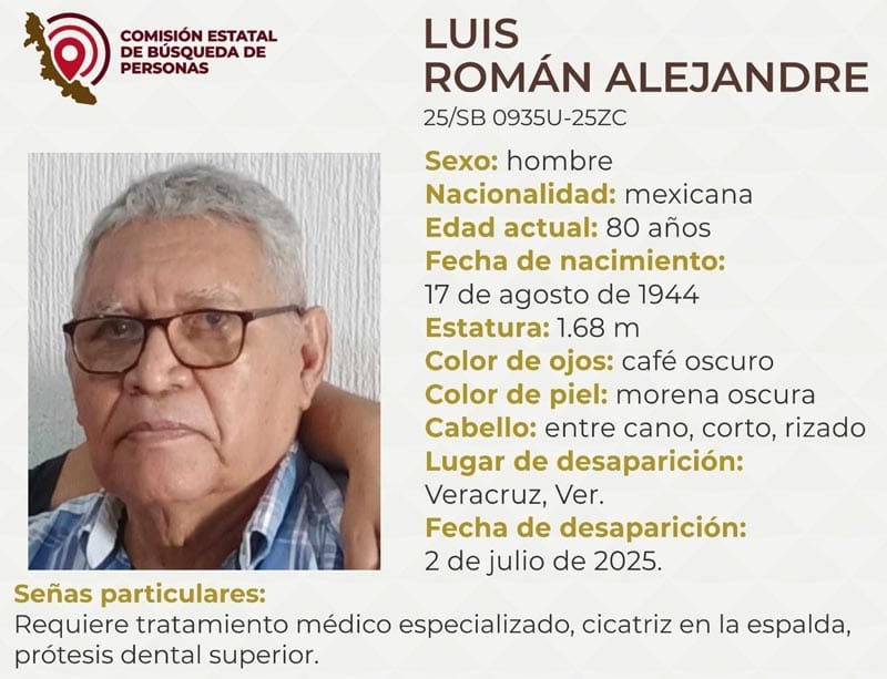 Su nombre sería Luis Román Alejandre, de 80 años, según una ficha emitida por la Comisión Estatal de Búsqueda.
