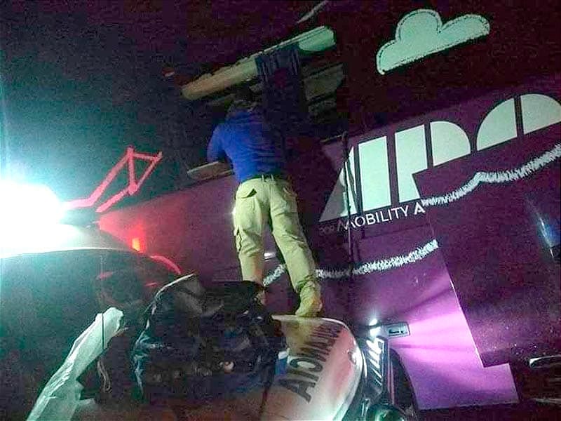 * Paramédicos auxiliaron a ocho pasajeros del autobús, el cual quedó con el frente desbaratado después de chocar por alcance contra un tráiler que transportaba un contenedor