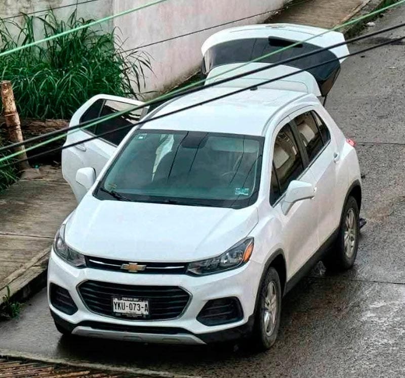 La camioneta Chevrolet Tracker de color blanco fue remolcada al corralón donde ha quedado a disposición de la fiscalía donde se radicó la Carpeta de Investigación por el homicidio múltiple.