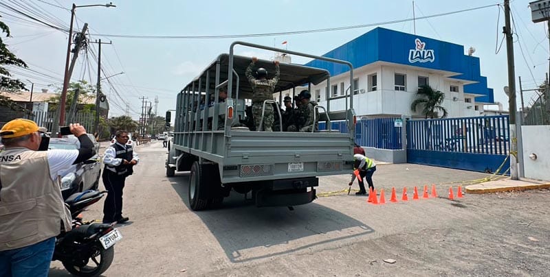 Oficiales de la policía estatal arribaron a bordo de la unidad SP-3043 para la atención del auxilio que reportó personal de la línea de emergencias C5i, sobre la explosión ocurrida en la planta de Lala, en la Bruno Pagliai del municipio de Veracruz.