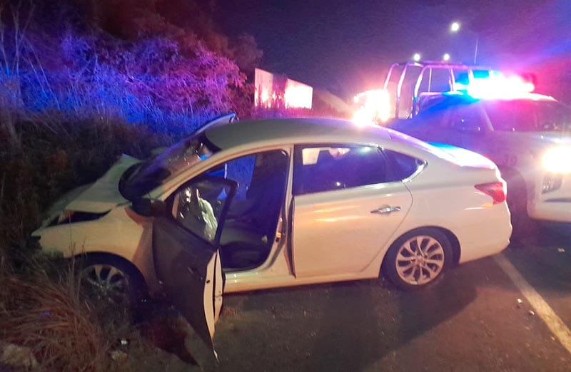 De repente, el coche fue impactado por detrás por un Nissan Sentra blanco, proyectándolos varios metros hacia adelante, la cual el conductor del Sentra perdió el control y terminó entre la maleza a varios metros del lugar del impacto.