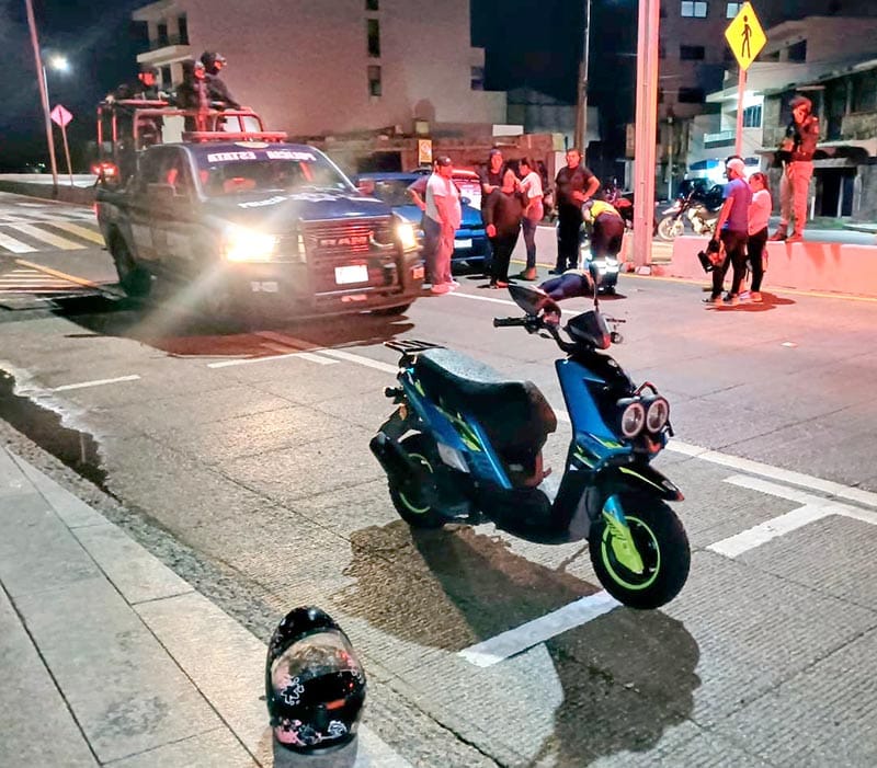 Una dama motociclista identificada como Fernanda Michelle C.R. resultó lesionada la madrugada del sábado al sufrir dos accidentes de tránsito en el lapso de una hora, los hechos ocurrieron en el municipio de Boca del Río.